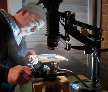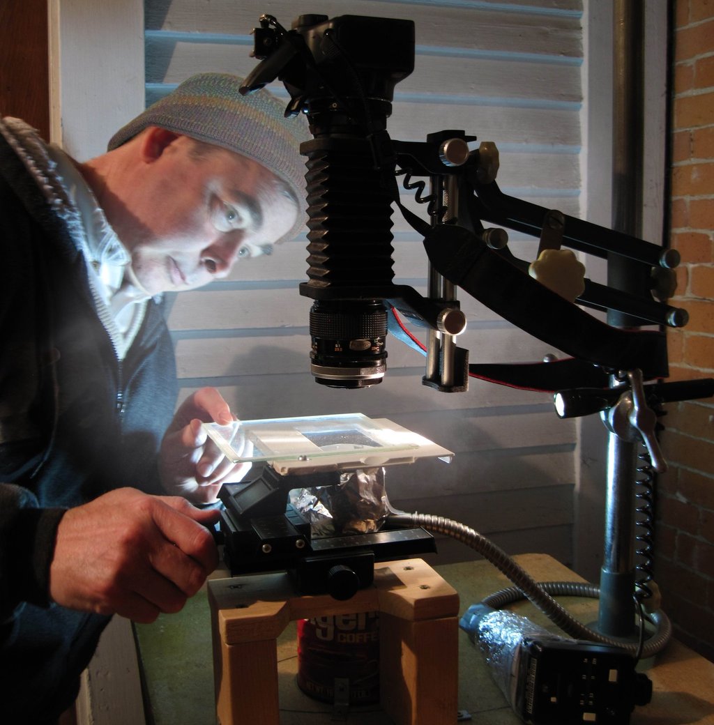 When I first began photographing snowflakes (Images 1-24) I used a Canon F1 camera mounted on a Zeiss microscope. My lighting was from a circular fluorescent tube to cut down on the heat and provide 360 degrees of illumination. Since switching over to a digital camera (Images 24-62) I now use a Canon Xsi camera on a bellows with a reverse-mounted 50mm macro lens. The lighting is now from an electronic flash connected by fiber optics to a ring light. The focus plane is set up similar to darkfield illumination to reveal a snowflake that has a black background and white edges. If I move the plane just slightly off-center I can show more of a three-dimensional look to the snowflake.